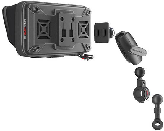 3 handlebar mounts are integrated into each box. 1. A tubular handlebar mount, 2. A mirror base mount, 3. A universal mount that will satisfy most sport bikes and maxi-scooters.